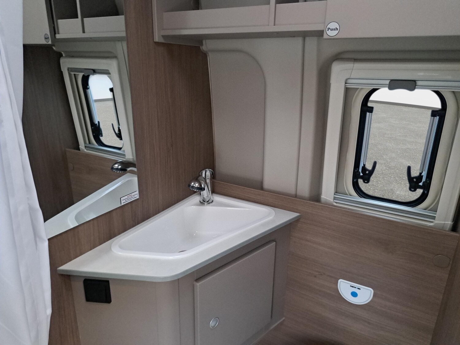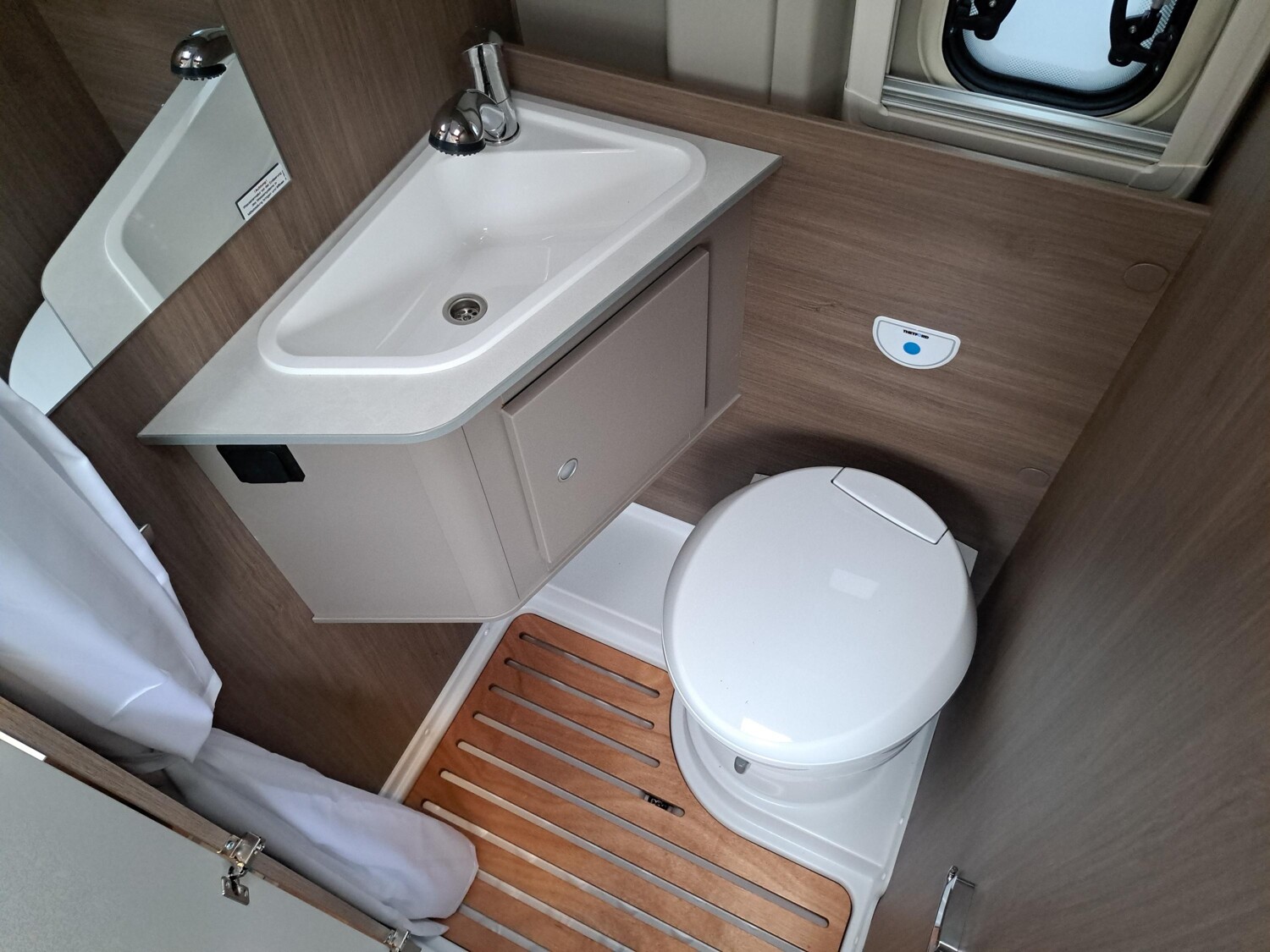 - Basic Paket (Dachhaube Midi Heki 70 x 50 cm über Sitzgruppe, Duschausstattung, Fenster im Bad, Kleiderstange in der Nasszelle, breite Einstiegsstufe, Drehplatte für Tischerweiterung an der Sitzgruppe)