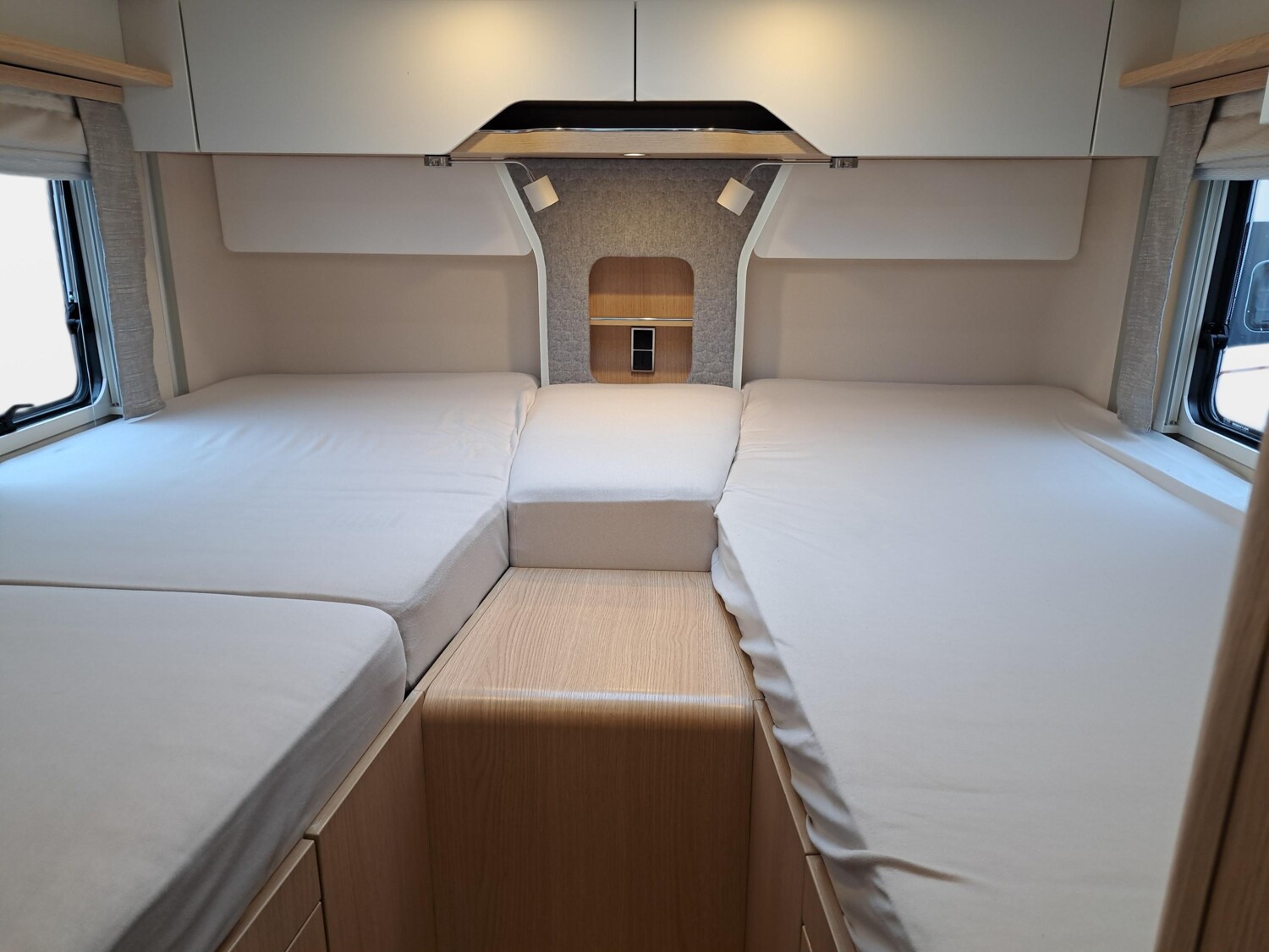 - Wohnkomfort-Paket 3 (Einlegeboden mit Holzoberfläche, 4 x 230 V / 1 x 12 V / 1 x Doppel-USB Zusatzsteckdosen sowie Wohnkomfortleuchten, Spannbettlaken nach Maß für Heckbetten individuell an Matratzenkonturen angepasst, 4 Kissen mit Bezug)