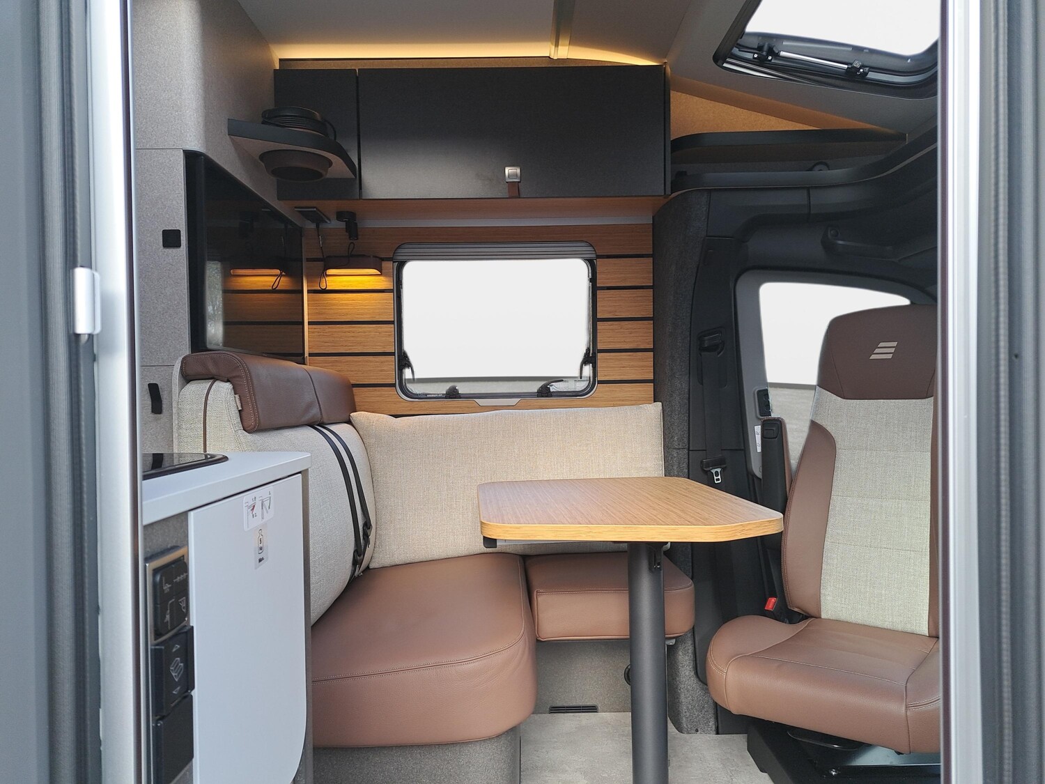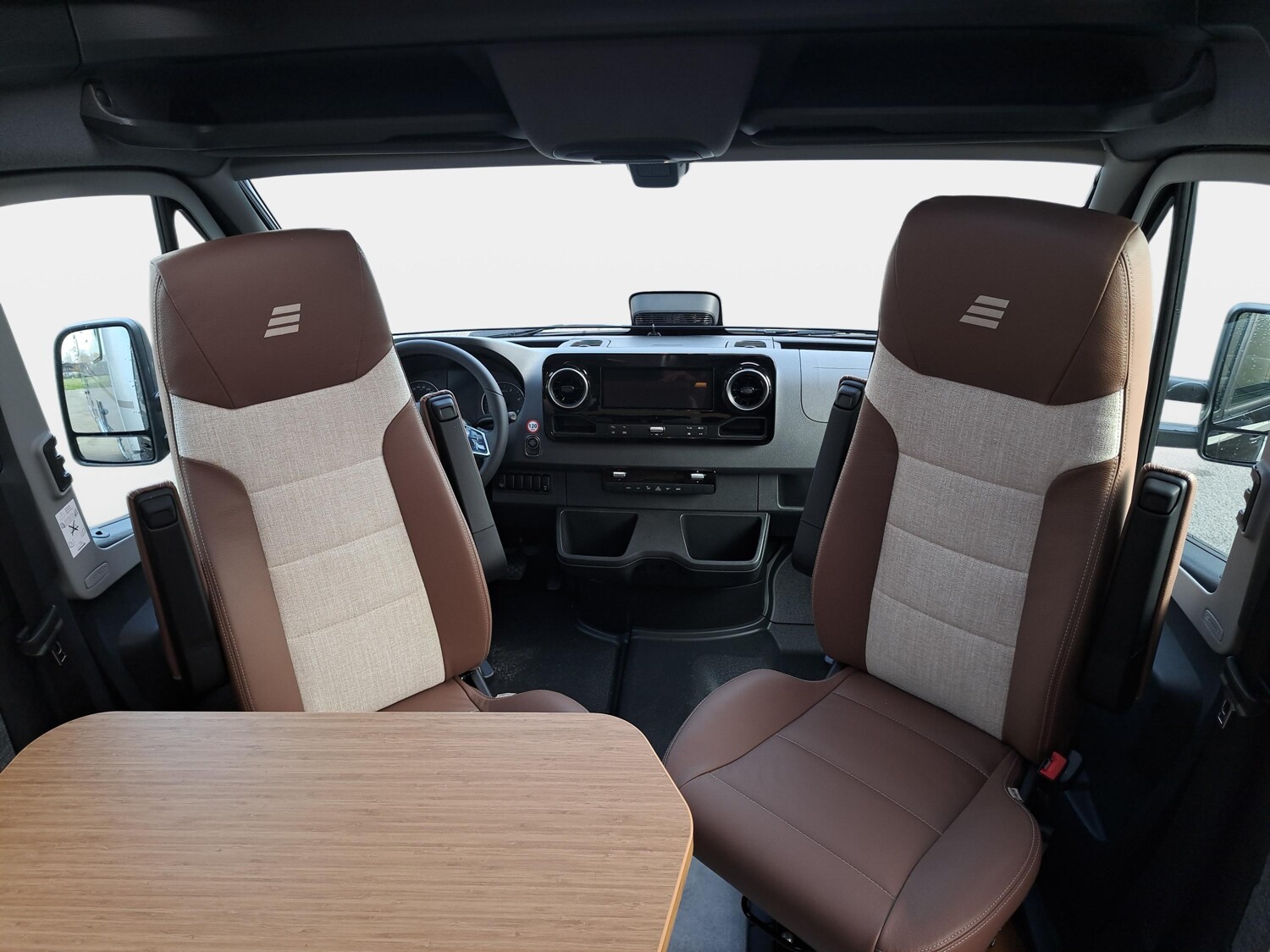 - Pilotensitze in Wohnraumstoff, dreh-/höhen- und neigungsverstellbar mit 2 Armlehnen sowie Sitzheizung und Lordosenverstellung