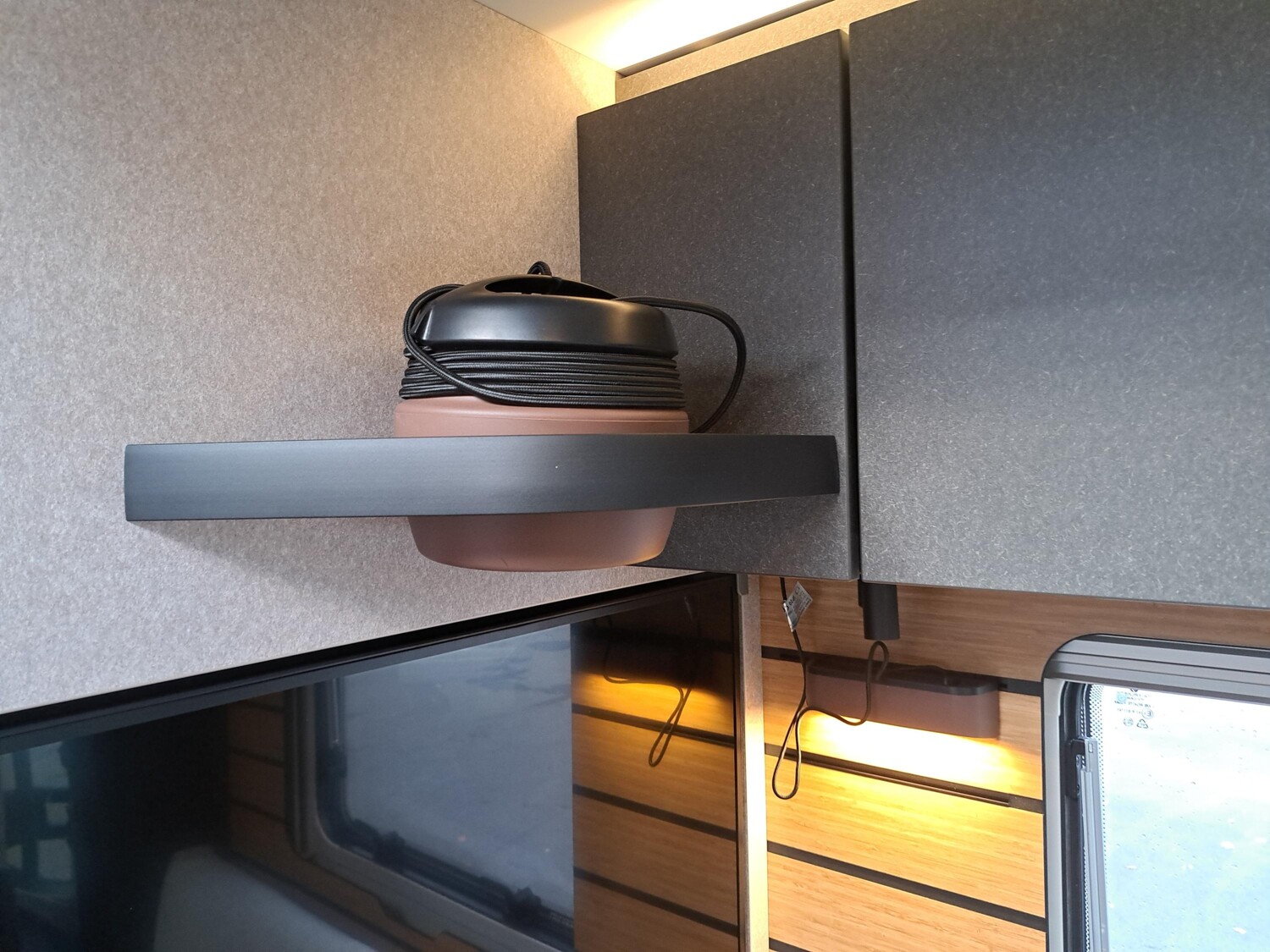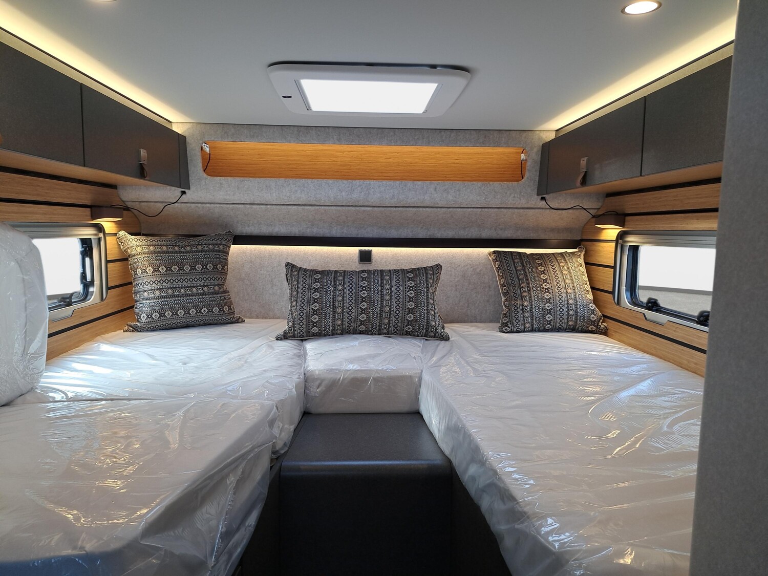 - Wohnkomfort-Paket (Schlafsystem mit Tellerfederrost für Heckbett(en), Spannbettlaken nach Maß für Heckbetten individuell an Matratzen angepasst, Filzverkleidung in Heckgarage, Einlegeboden in der Dusche für ebenen Laufboden, 4 Kissen mit Bezug, Ambient-Light-System: Mehr-Ebenen Lichtsystem mit dynamischer und individueller Steuerung der Beleuchtung (inkl. Lichttemperatur) sowie stimmungsvoller Sockelbeleuchtung, Lichtpaket (Multifunktionale Pendelleuchte sowie eine Ambiente-Leseleuchte für die Multifunktionswände), 3 x 230 V / 1 x 12 V Zusatzsteckdosen)