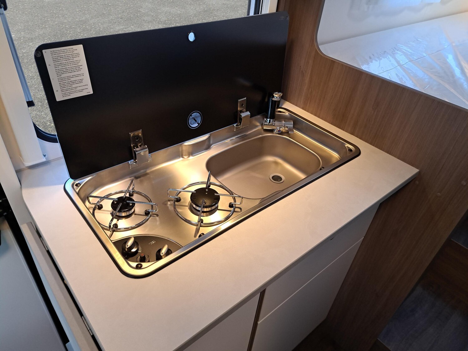 auschrankklappen und Türen in Cosy White, Beklebung Pro+, Markise 4 m, Abwa