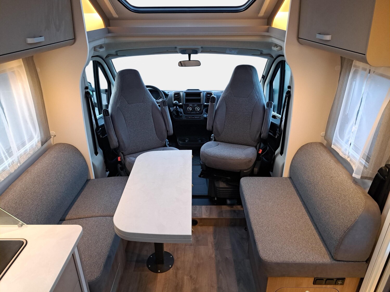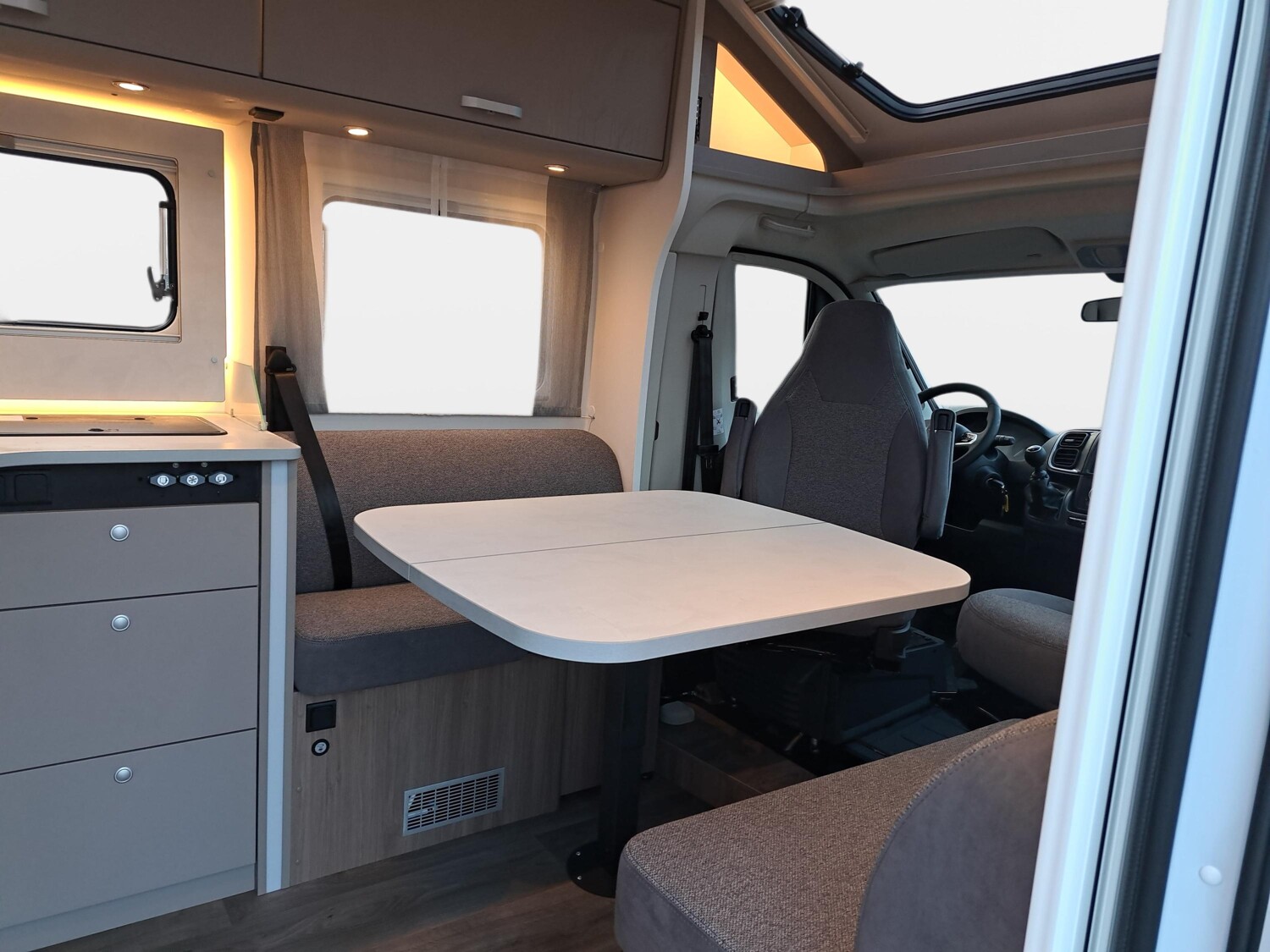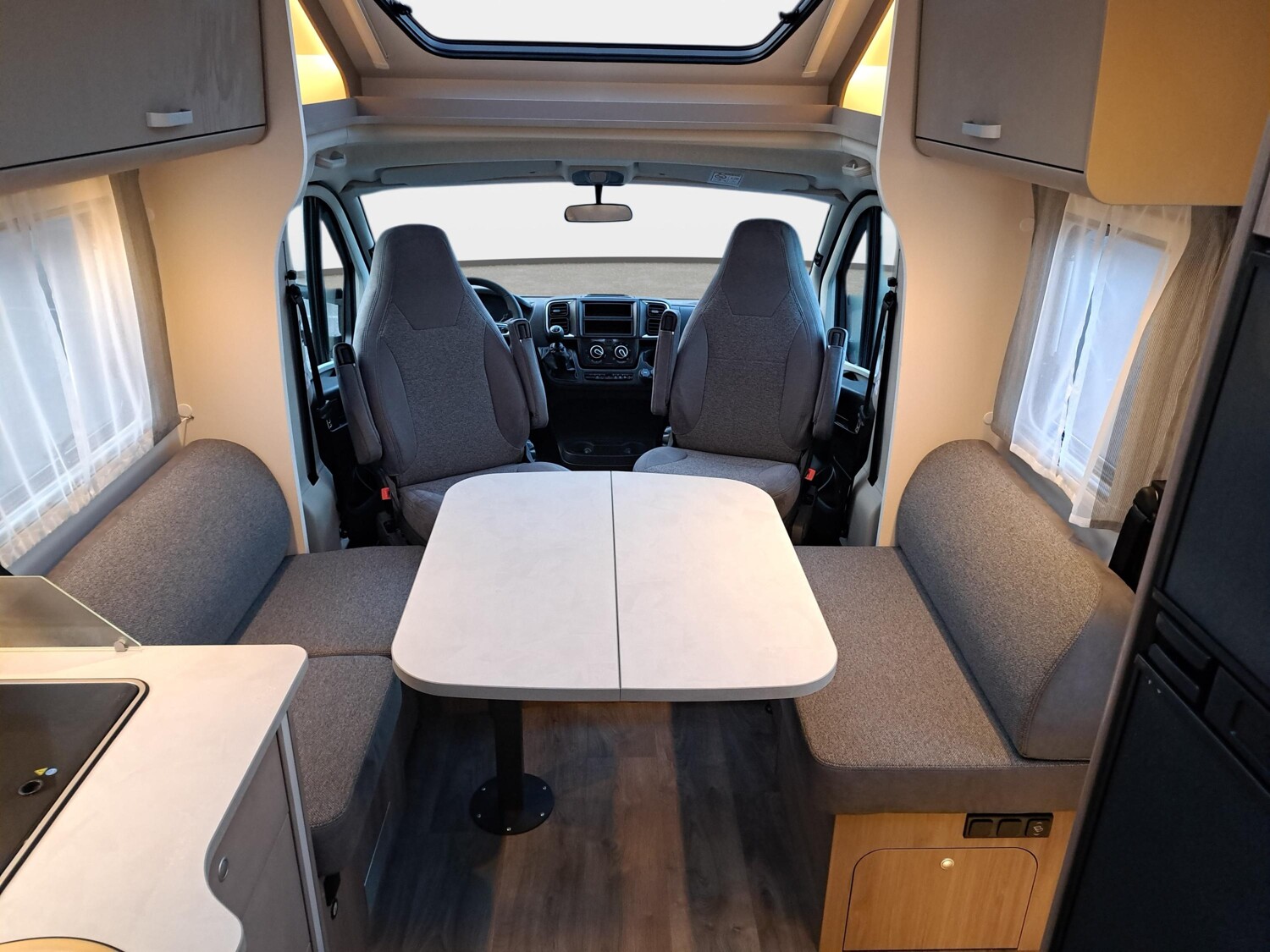 - Pro+ Paket (Optik Paket 1, Optik Paket 2, Chassisfarbe Artense Grau Metallic, Basic Paket, Faltverdunkelung Fahrerhaus, Fenster in Fronthaube, großer Kühlschrank 156 l mit separatem Frosterfach 29 l, Abwassertank isoliert, Markise 4,5 m, Rahmenfenster, Design Applikation Heck, Zweite Außenstauraumklappe (Größe modellabhängig), Beklebung pro+)