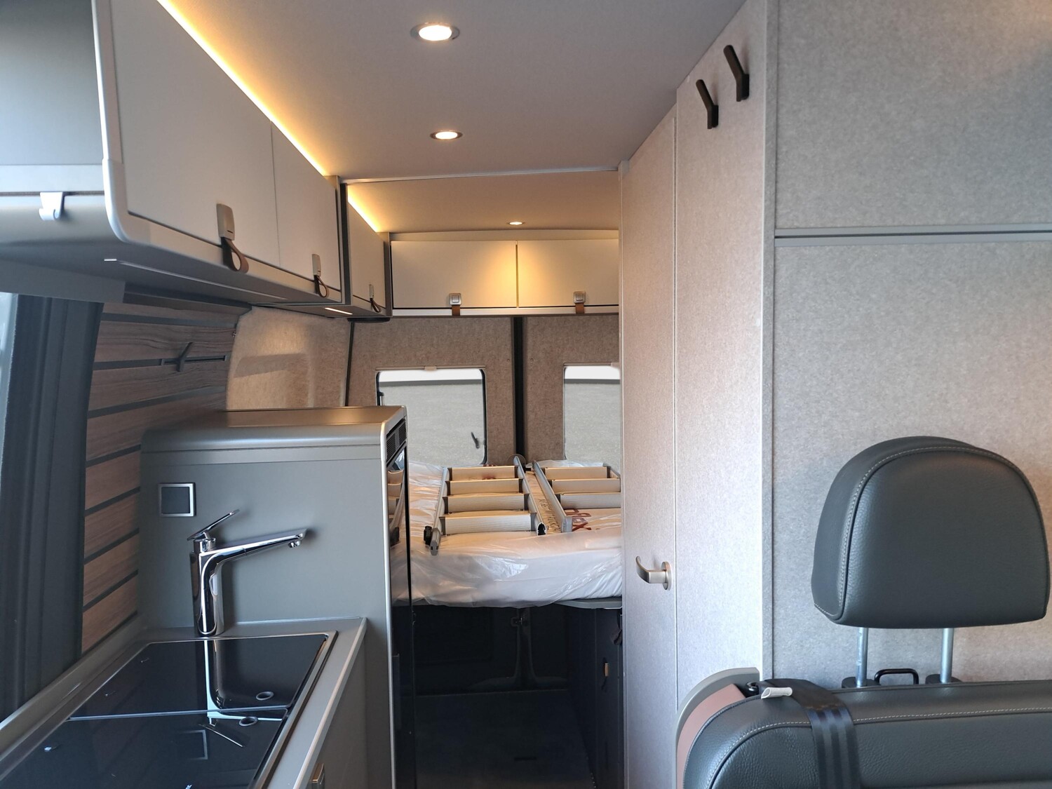 - Wohnkomfort-Paket GCS (Ambient-Light-System: Mehr-Ebenen Lichtsystem mit dynamischer und individueller Steuerung der Beleuchtung (inkl. Lichttemperatur) sowie stimmungsvoller Sockelbeleuchtung, Wohnwelt "HOME" (2 Kissen und Stofftasche), Spannbettlaken nach Maß für Heckbetten individuell an Matratzen angepasst, Einlegeboden mit Korkoberfläche)