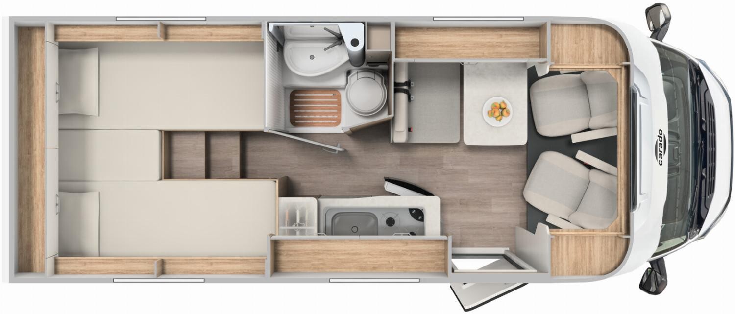 - Pro Paket: Stoßfänger lackiert, Faltverdunkelung Fahrerhaus, Fenster in V-Haube, Sonderfarbe Dachstauschrankklappen und Türen in Cosy White Beklebung pro, Abwassertank isoliert, 2. Außenstauraumklappe, Basic Paket