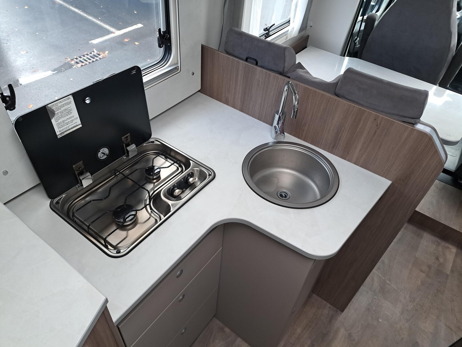 - pro+ Paket (Basic Paket, Style Paket, TV Paket, 16" Alufelgen, Faltverdunkelung Fahrerhaus, Fenster in Fronthaube, Großer Kühlschrank 156 l mit separatem Frosterfach 29 l, Abwassertank isoliert, Markise 4 m, Rahmenfenster, Design Applikation Heck, 2. Außenstauraumklappe 80 x 85 cm, Beklebung pro+)