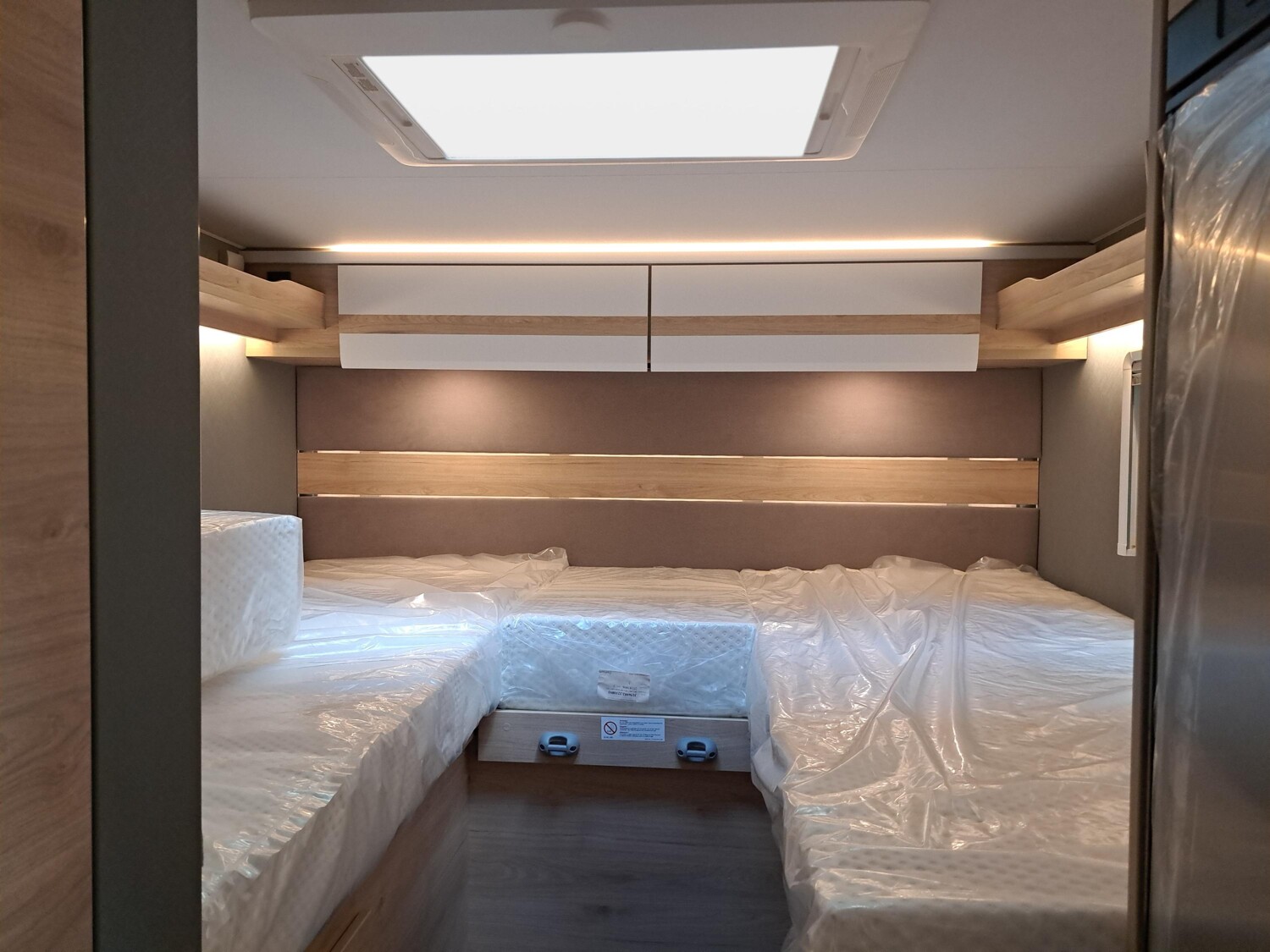 AusstattungFahrzeugABS Einparkhilfe ESP Multifunktionslenkrad Navigationssystem Radio DAB-Radio Russpartikelfilter Servolenkung Tempomat Zentralverriegelung InnenLederlenkrad Rollrost WC Doppelbett Einzelbetten Hubbett L-Sitzgruppe AussenGFK Heckgarage Markise ExtrasBeschreibung