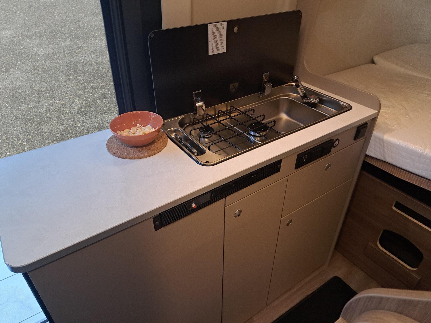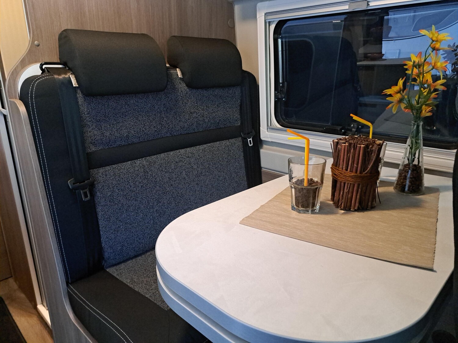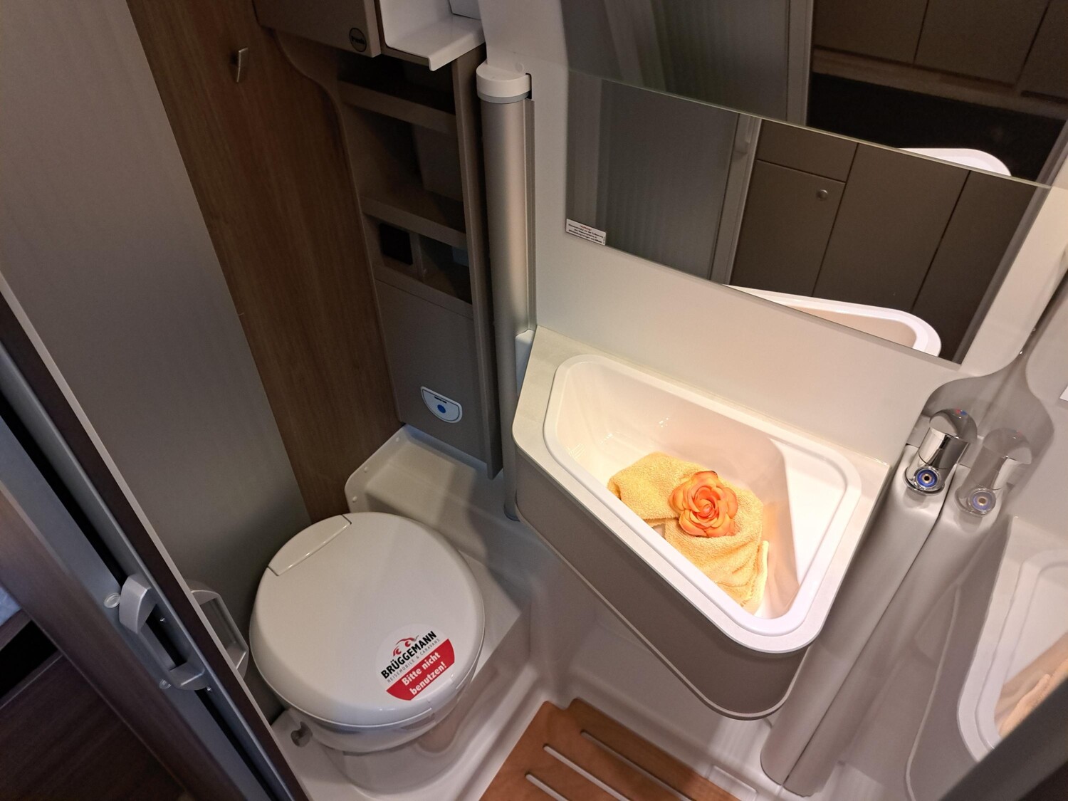 - Basic Paket (Dachhaube Midi- Heki 70 x 50 cm über Sitzgruppe, Duschausstattung (Brausekopf ausziehbar, Duschvorhang, Führungsschiene, Brausehalter), Fenster im Bad, Kleiderstange in der Nasszelle, Breite Einstiegsstufe, Drehplatte für Tischerweiterung an der Sitzgruppe)