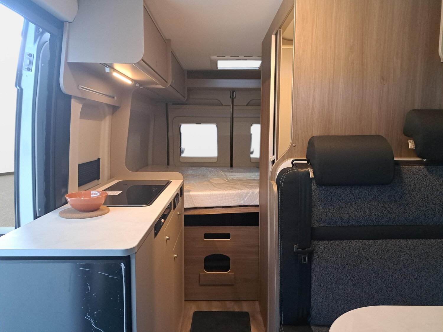- Pro+ Paket (Optik Paket 1, Optik Paket 2, Basic Paket, Dieseltank 90l, Faltverdunklung Fahrerhaus, Rahmenfenster, Markise 3,75m schwarz, Beklebung Pro+, LED-Beleuchtung integriert über den Dachschränken, Panoramafenster über Fahrer- und Beifahrersitz, Heckdachstauschrank umlaufend)