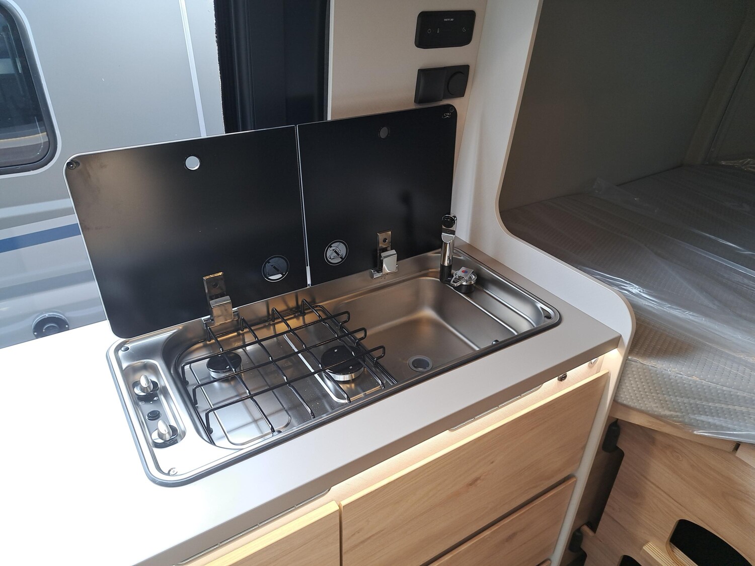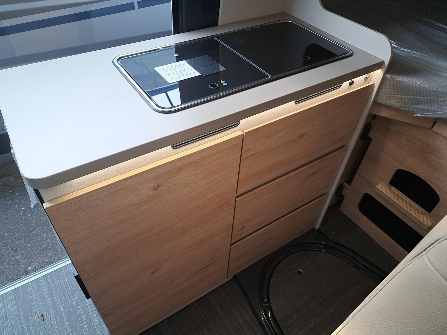 - Elektro Paket (Zusätzliche Doppel-USB-Steckdose im Bug links, 12-V-Steckdose im Heckbereich links unten, 230-V-Steckdose im Oberschrank Bug links (Sitzgruppe), Indirekte Beleuchtung, LED-Lichtröhre in der Küche, Vorbereitung Solarmodule)