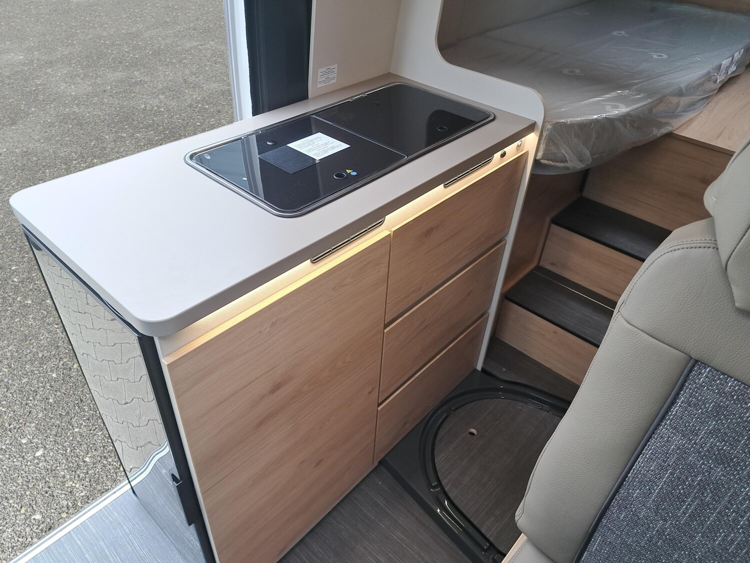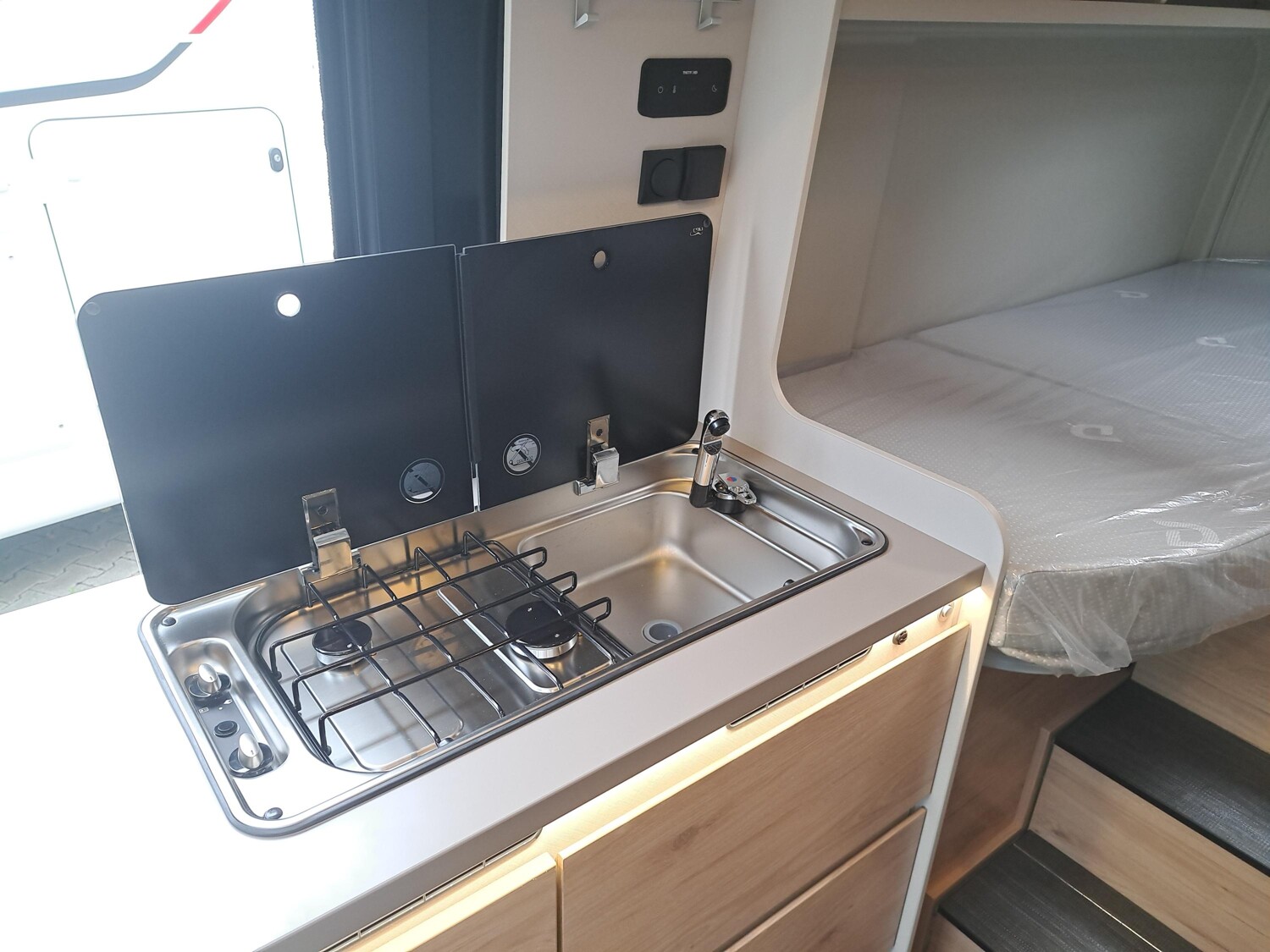 - Elektro Paket (Zusätzliche Doppel-USB-Steckdose im Bug links, 12-V-Steckdose im Heckbereich links unten, 230-V-Steckdose im Oberschrank Bug links (Sitzgruppe), Indirekte Beleuchtung, LED-Lichtröhre in der Küche, Vorbereitung Solarmodule)