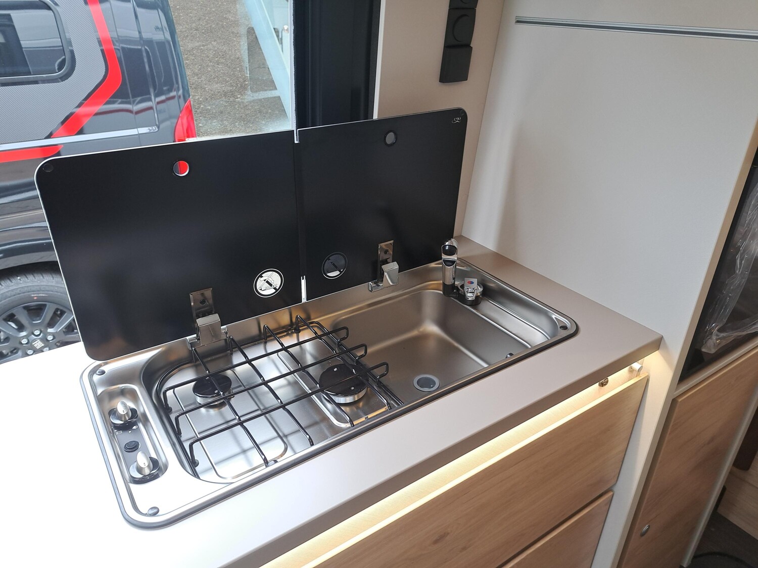 - Elektro Paket (Zusätzliche Doppel-USB-Steckdose im Bug links, 12-V-Steckdose im Heckbereich links unten, 230-V-Steckdose im Oberschrank Bug links (Sitzgruppe), Indirekte Beleuchtung, LED-Lichtröhre in der Küche, Vorbereitung Solarmodule)
