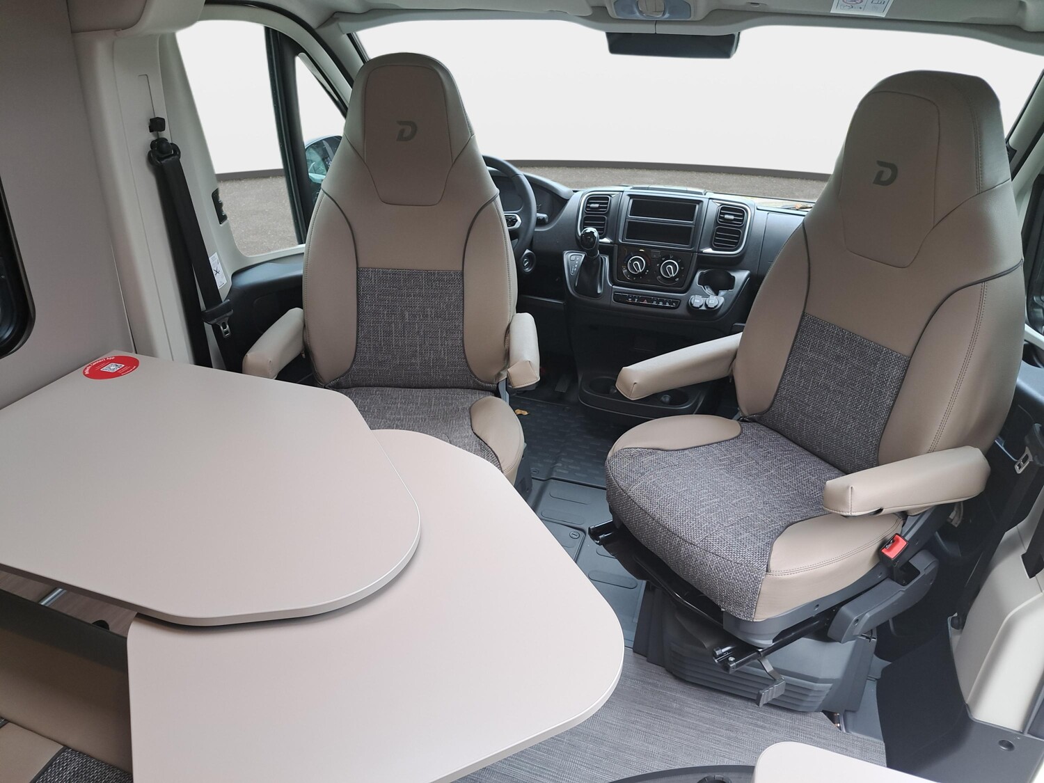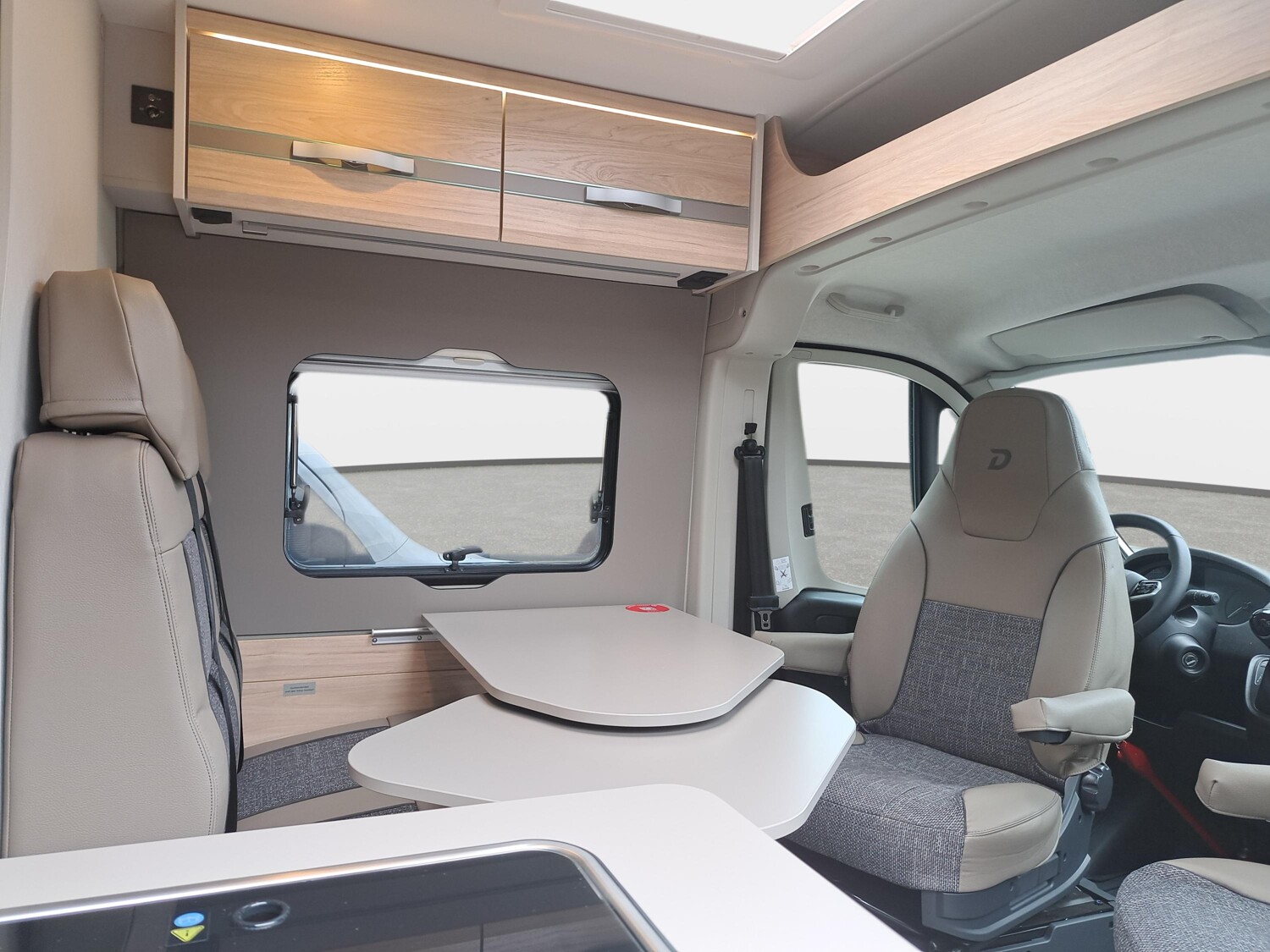 - Komfort Paket (600 DK / DS / DR) (Rahmenfenster, Fenster mit Fliegenschutz und Verdunklungsrollo im Heck links, Markise 3,75 m (600), Innovativer Auszug unter dem Heckbett, Teppich auf Podest (gekettelt, lose verlegt), Vorzeltleuchte, Drehplatte für Tischerweiterung)