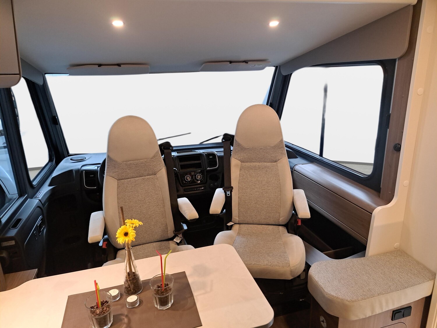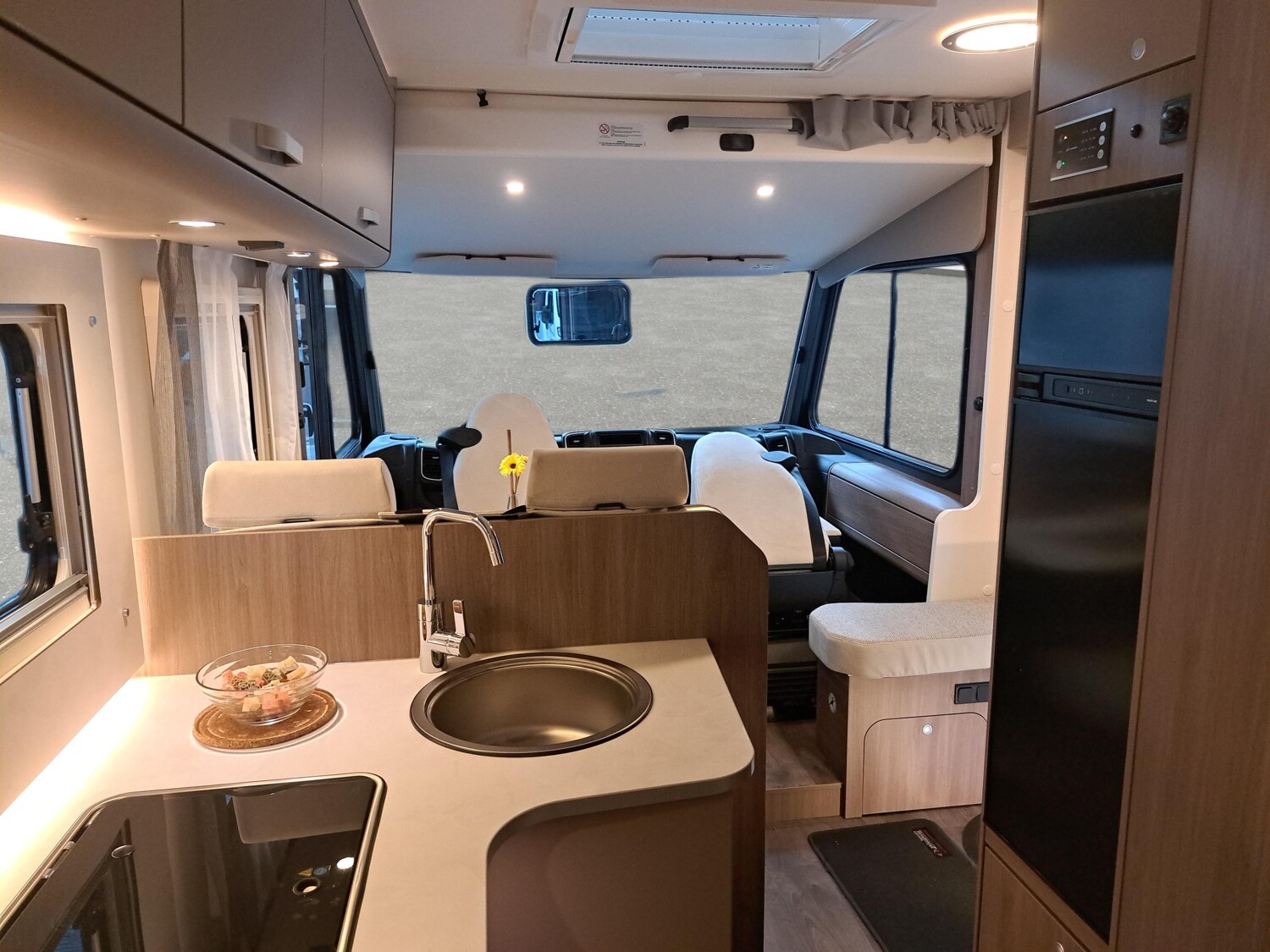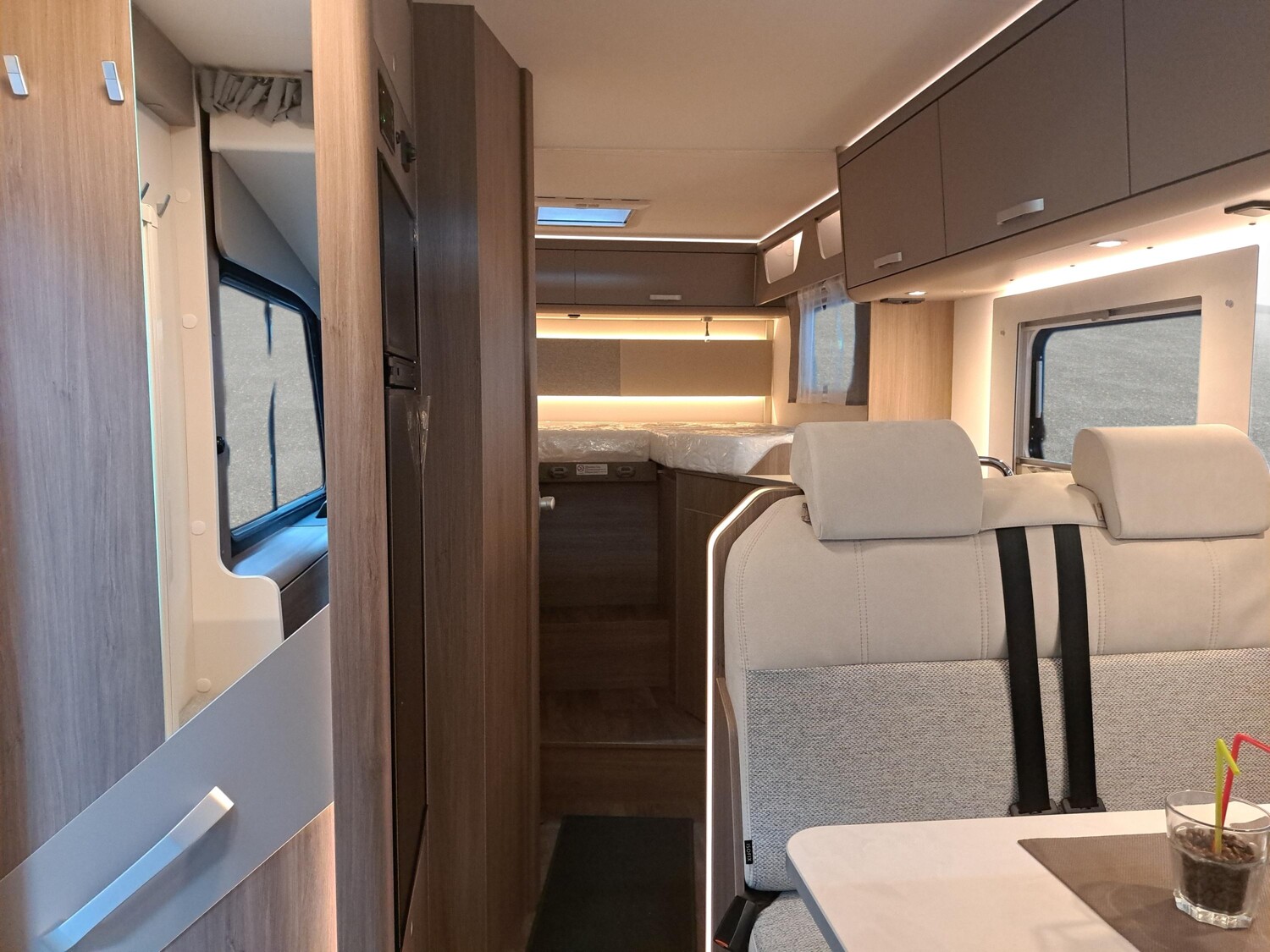 - pro+ Paket (Basic Paket, Optik Paket 2, TV Paket, großer Kühlschrank 156 l mit separatem Frosterfach 29 l, Abwassertank isoliert, Rahmenfenster, Markise 4,5 m, Design Applikation Heck, Zweite Außenstauraumklappe, Beklebung pro+)