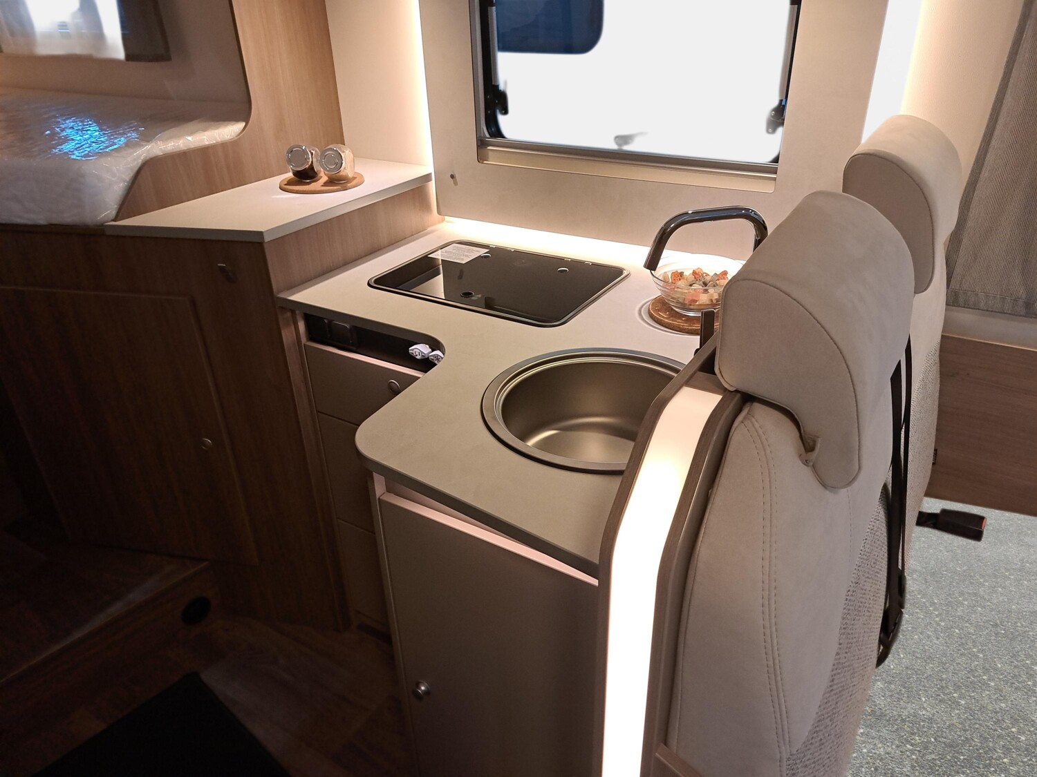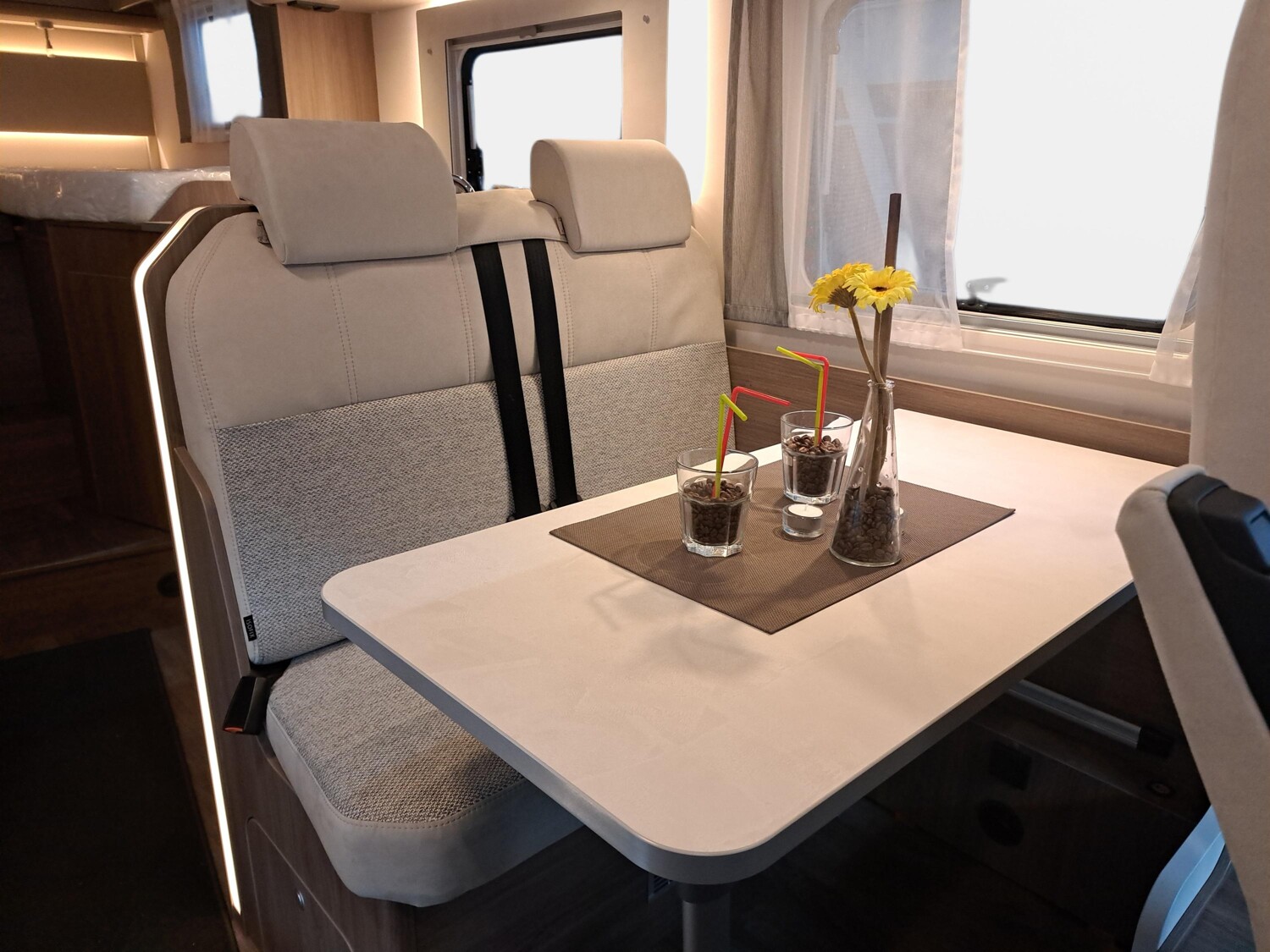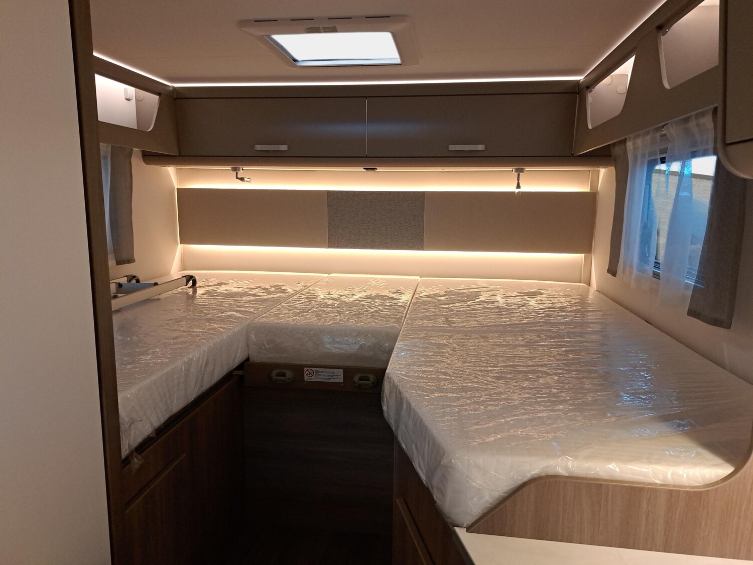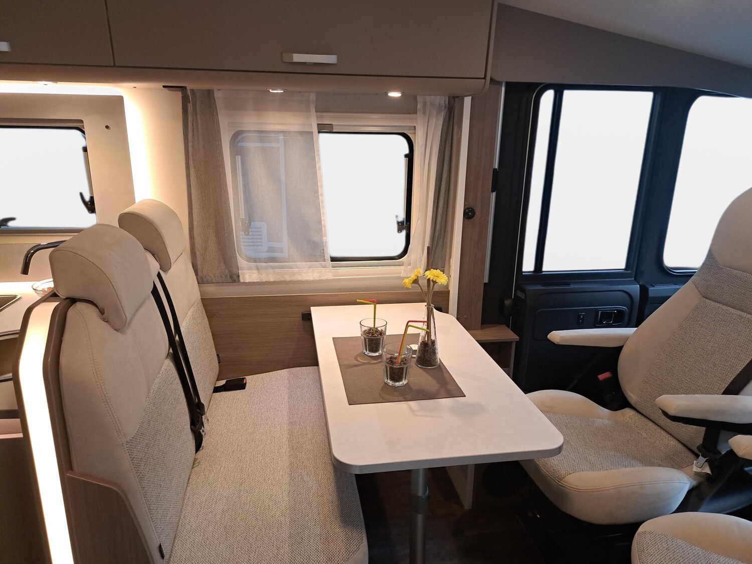 - pro+ Paket (Basic Paket, Optik Paket 2, TV Paket, großer Kühlschrank 156 l mit separatem Frosterfach 29 l, Abwassertank isoliert, Rahmenfenster, Markise 4,5 m, Design Applikation Heck, Zweite Außenstauraumklappe, Beklebung pro+)
