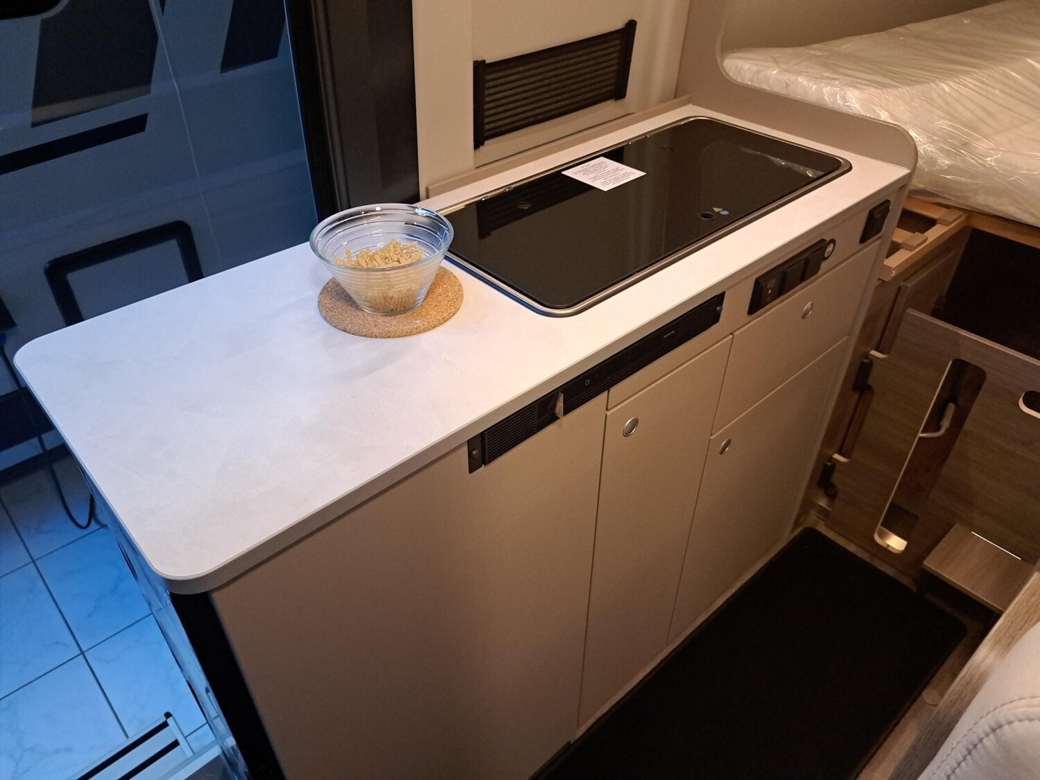 - Basic Paket (Dachhaube Midi- Heki 70 x 50 cm über Sitzgruppe, Duschausstattung (Brausekopf ausziehbar, Brausehalter), Fenster im Bad, Kleiderstange in der Nasszelle, Breite Einstiegsstufe, Drehplatte für Tischerweiterung an der Sitzgruppe)