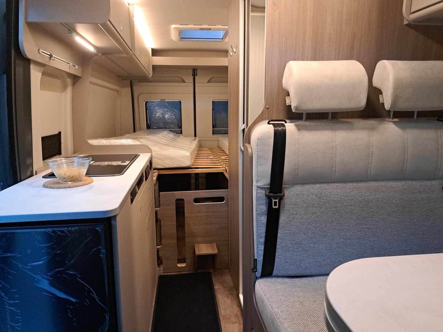 - Pro+ Paket (Optik Paket 1, Optik Paket 2, Basic Paket, Dieseltank 90l, Rahmenfenster, Beklebung Alternativ, Markise 4,0 m schwarz, Faltverdunklung Fahrerhaus, LED-Beleuchtung integriert über den Dachschränken, Panoramafenster über Fahrer- und Beifahrersitz,Heckdachstauschrank umlaufend)