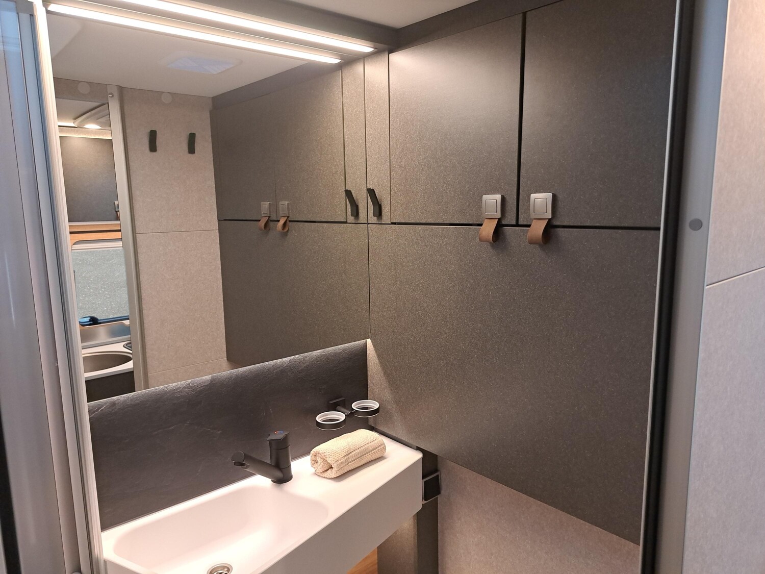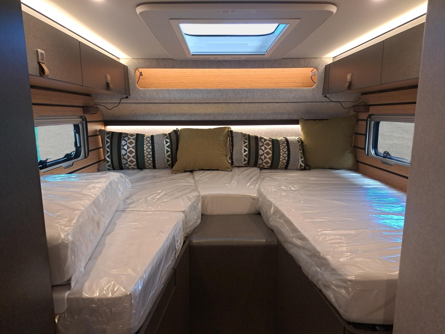 - Wohnkomfort-Paket (Schlafsystem mit Tellerfederrost für Heckbett(en), Spannbettlaken nach Maß für Heckbetten individuell an Matratzen angepasst, Filzverkleidung in Heckgarage, Einlegeboden in der Dusche für ebenen Laufboden, 4 Kissen mit Bezug, Ambient-Light-System: Mehr-Ebenen Lichtsystem mit dynamischer und individueller Steuerung der Beleuchtung (inkl. Lichttemperatur) sowie stimmungsvoller Sockelbeleuchtung, Lichtpaket (Multifunktionale Pendelleuchte sowie eine Ambiente-Leseleuchte für die Multifunktionswände), 3 x 230 V / 1 x 12 V Zusatzsteckdosen)