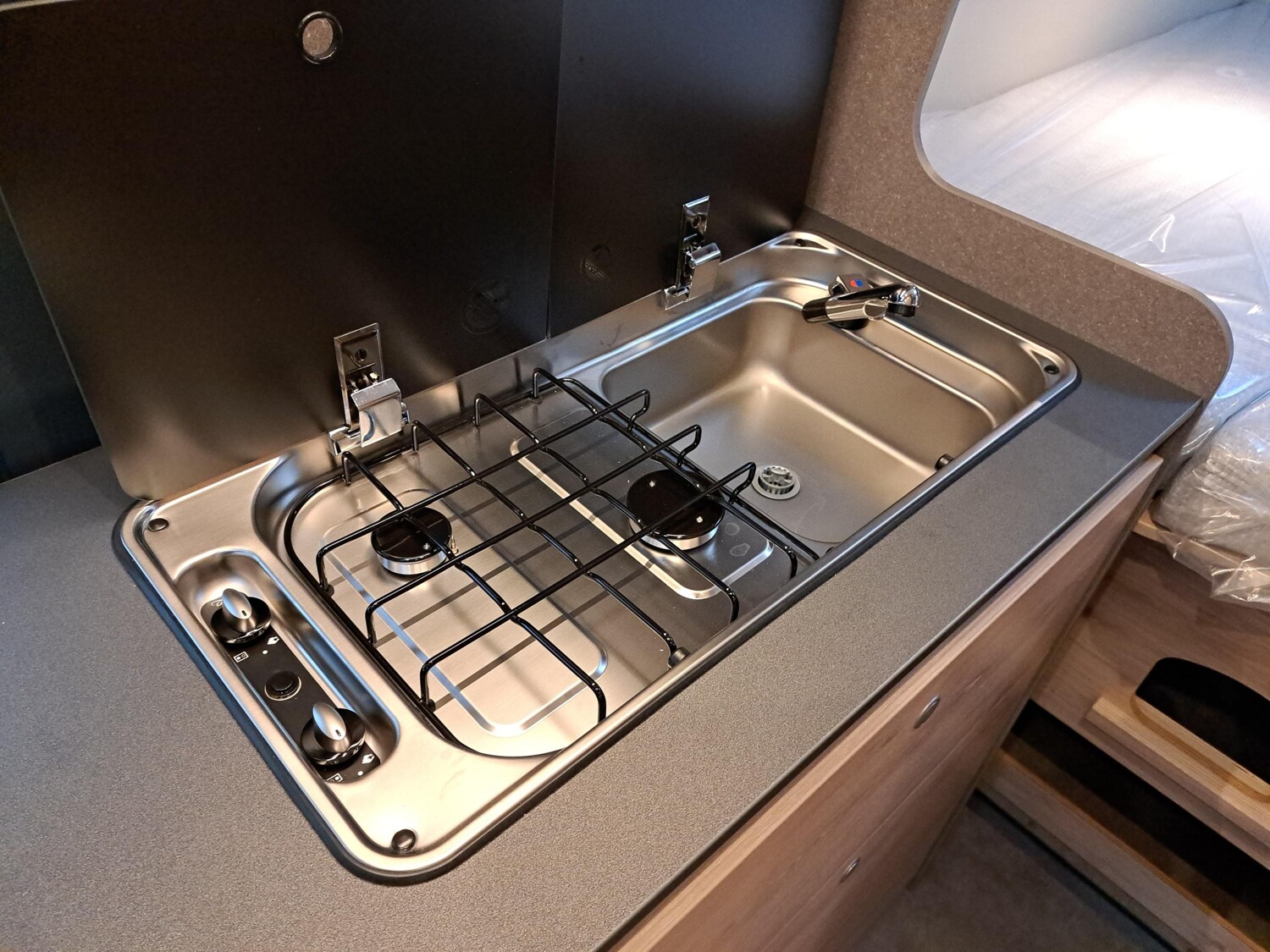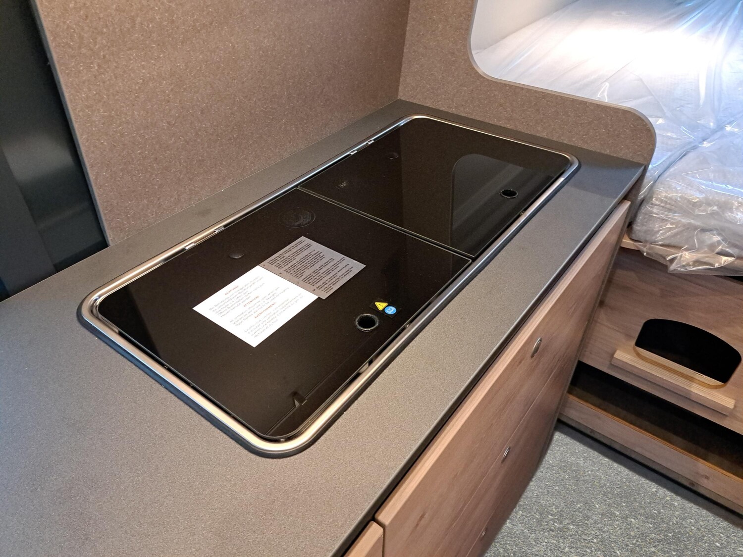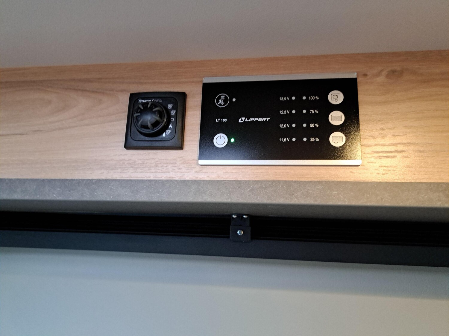 der Küche, 230-V-Steckdose im Oberschrank Bug links (Sitzgruppe), 12-V-Ste